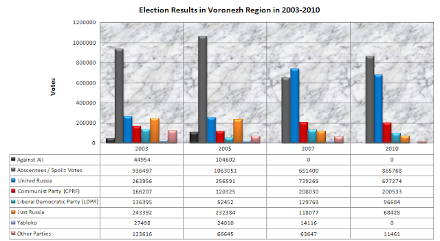 One can see that turnout in the 2010 winter elections was reduced in comparison with the 2007 Duma elections, and this resulted in reduction of percentage of United Russia. This is typical for all regions where elections were held in 2010.