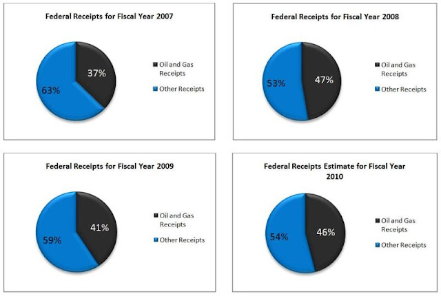It is necessary to pay attention, that oil and gas incomes were not detailed in the federal budget during 1999-2003. It means that in 1999-2003 percentage of oil and gas incomes in federal receipts were even lower, than that is indicated at circular graphs. Oil and gas incomes for 2004-2010 are calculated by summation of budget receipts from the tax on mining operations with hydrocarbon raw materials, the export duties on crude oil, oil products and natural gas. Oil and gas incomes for 1999-2003 are calculated by assembling of excises on natural gas, oil and stable gas condensate, royalties, the tax on mining operations, contributions for reproduction of a raw-material base and export duties.